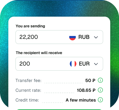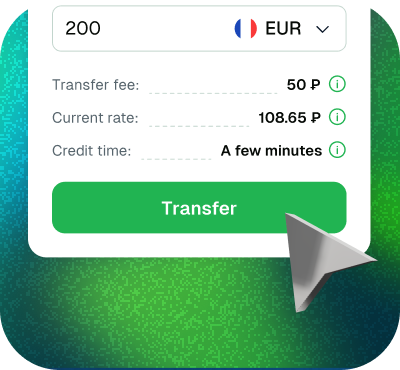 4.9 ₽, 1.5 €, 1 £ - fixed fees for multi-currency transfers. You see the exchange rate, fee, and amount to be credited to the recipient before sending money